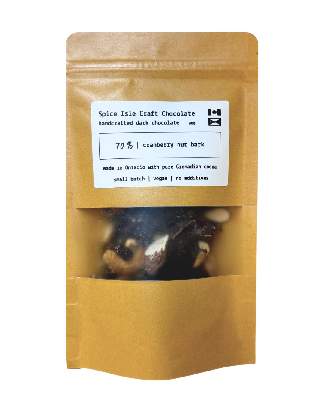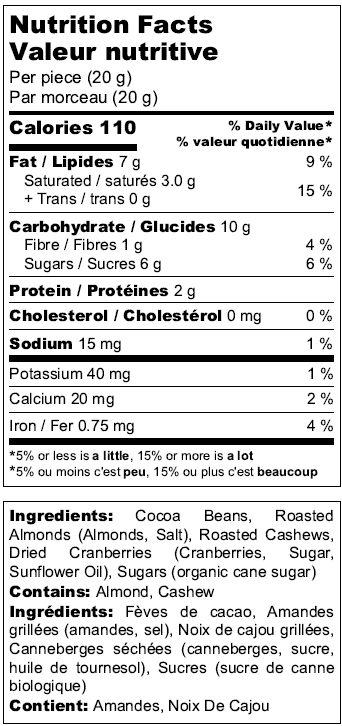 A vibrant mix of tangy cranberries and crunchy nuts in smooth dark chocolate. A satisfying balance of sweet, tart, and texture.