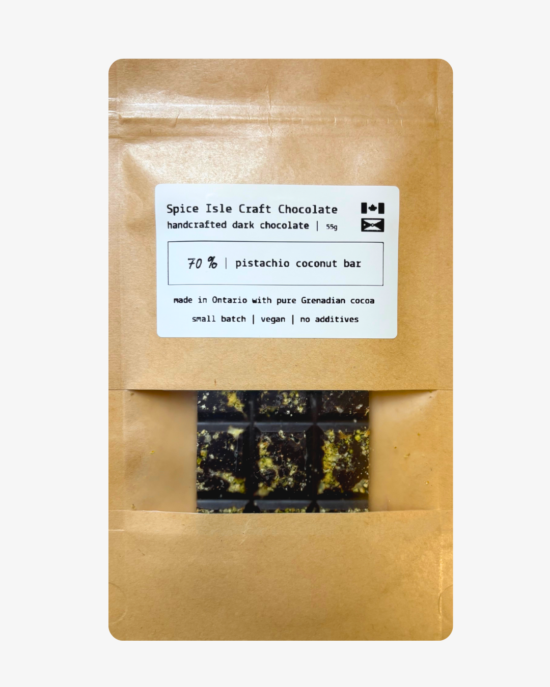 This 70% dark chocolate is made from single-origin Grenadian cacao and finished with roasted pistachios and a light touch of toasted coconut for texture and contrast.